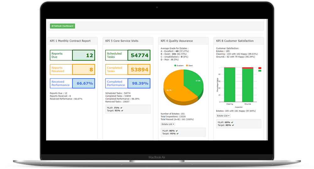 As the number of jobs and housing associations handled by the FM company increased, the system grew into an extensive web based system which allowed the efficient scheduling of thousands of jobs per week. By retrieving the data gathered on the hand held devices, the system provided comprehensive management information and KPI dashboards of job completion and performance.
