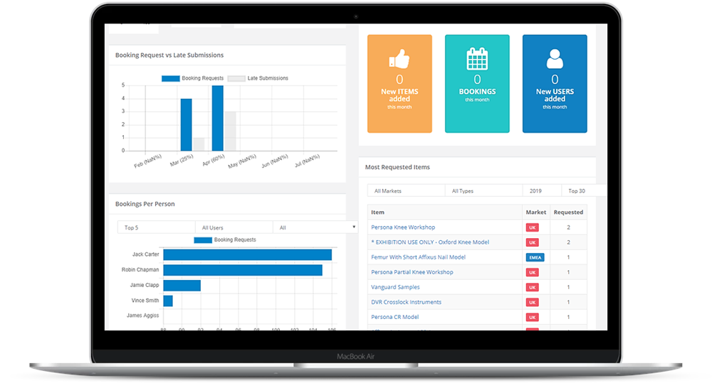 The new system facilitates an efficient solution to the logistical problem of supplying demonstration and marketing materials to sales personnel in the field. It gives the marketing department visibility of stock levels and allows them to easily manage the booking request through its life cycle. Management reports, KPIs and dashboard displays allows both front line and back room staff to work better.