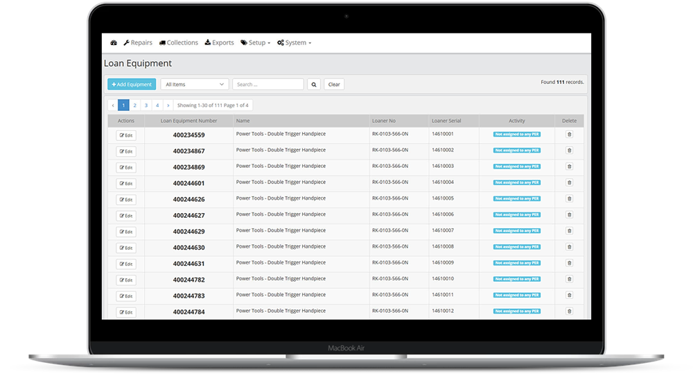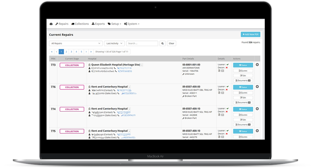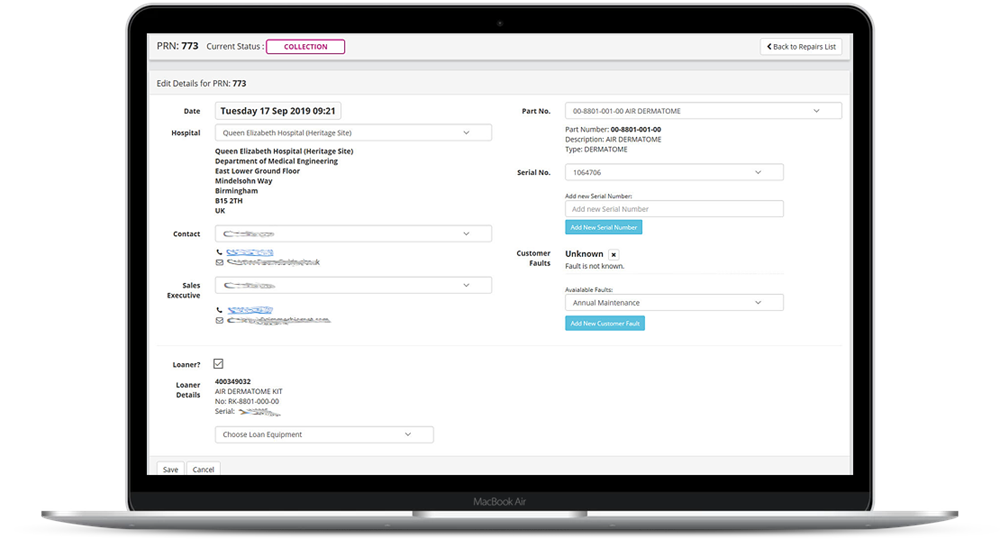 We implemented a web based solution which allowed the whole repair/servicing cycle to be managed in a single system. The job starts by logging the repair request for the customer. Emails are generated to confirm the repair and couriers are contacted to pick up the equipment. After service or repair at another facility the equipment is returned to the customer. The system also tracks loaned equipment and documentation required as these could be medical supplies.